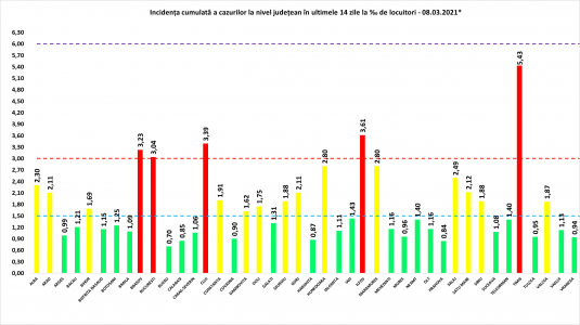 Coeficientul infectărilor cumulate la 14 zile, raportate la 1.000 de locuitori este calculat de către Direcțiile de Sănătate Publică, la nivelul Municipiului București și al județelor. Mai jos aveți graficul realizat în baza raportărilor primite de CNCCI de la Direcțiile de Sănătate Publică:
