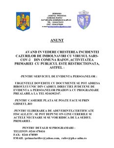Comitetul Local pentru Situații de Urgență al localității Râfov ia măsuri speciale în vederea limitării răspândirii virusului Covid-19.