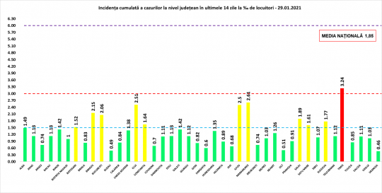 Coeficientul infectărilor cumulate la 14 zile, raportate la 1.000 de locuitori este calculat de către Direcțiile de Sănătate Publică, la nivelul Municipiului București și al județelor. Mai jos aveți graficul realizat în baza raportărilor primite de CNCCI de la Direcțiile de Sănătate Publică: