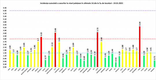 Coeficientul infectărilor cumulate la 14 zile, raportate la 1.000 de locuitori este calculat de către Direcțiile de Sănătate Publică, la nivelul Municipiului București și al județelor. Mai jos aveți graficul realizat în baza raportărilor primite de CNCCI de la Direcțiile de Sănătate Publică: