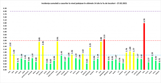 Coeficientul infectărilor cumulate la 14 zile, raportate la 1.000 de locuitori este calculat de către Direcțiile de Sănătate Publică, la nivelul Municipiului București și al județelor. Mai jos aveți graficul realizat în baza raportărilor primite de CNCCI de la Direcțiile de Sănătate Publică: