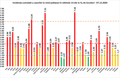 Coeficientul infectărilor cumulate la 14 zile, raportate la 1.000 de locuitori este calculat de către Direcțiile de Sănătate Publică, la nivelul Municipiului București și al județelor. Mai jos aveți graficul realizat în baza raportărilor primite de CNCCI de la Direcțiile de Sănătate Publică: