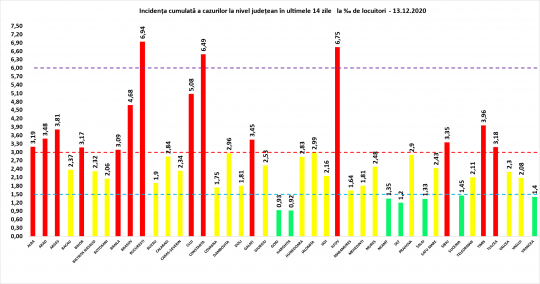 Coeficientul infectărilor cumulate la 14 zile, raportate la 1.000 de locuitori este calculat de către Direcțiile de Sănătate Publică, la nivelul Municipiului București și al județelor. Mai jos aveți graficul realizat în baza raportărilor primite de CNCCI de la Direcțiile de Sănătate Publică:
