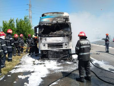 Astăzi, în jurul orei 12.00, un TIR care circula pe Centura de Vest a Ploieştiului a luat foc în trafic. Incendiul s-a manifestat cu violenţă la cabină, iar apoi s-a extins și la remorcă. Pompierii au acţionat cu două echipaje de stingere şi o ambulanţă SMURD. Din fericire, nu s-au înregistrat victime. TIR-ul transporta apa plată.