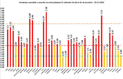 Coeficientul infectărilor cumulate la 14 zile, raportate la 1.000 de locuitori este calculat de către Direcțiile de Sănătate Publică, la nivelul Municipiului București și al județelor. Mai jos aveți graficul realizat în baza raportărilor primite de CNCCI de la Direcțiile de Sănătate Publică: