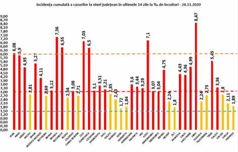 Coeficientul infectărilor cumulate la 14 zile, raportate la 1.000 de locuitori este calculat de către Direcțiile de Sănătate Publică, la nivelul Municipiului București și al județelor. Mai jos aveți graficul realizat în baza raportărilor primite de CNCCI de la Direcțiile de Sănătate Publică:
