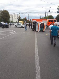 O ambulanţă care transporta o pacientă a fost răsturnată într-un accident rutier. Accidentul s-a produs în Ploieşti, la intersecţia Bulevardul Republicii cu Şoseaua Vestului (zona McDonald’s). Ambulanţa, ce se deplasa dinspre Vest către Nord, cu semnalele acustice şi luminoase în funcţiune, a intrat în coliziune cu un autoturism circulând dispre nord către centru şi care nu ar fi oprit pentru a acorda prioritate de trecere ambulanţei care avea acest drept.