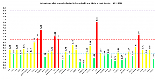 Coeficientul infectărilor cumulate la 14 zile, raportate la 1.000 de locuitori este calculat de către Direcțiile de Sănătate Publică, la nivelul Municipiului București și al județelor. Mai jos aveți graficul realizat în baza raportărilor primite de CNCCI de la Direcțiile de Sănătate Publică: