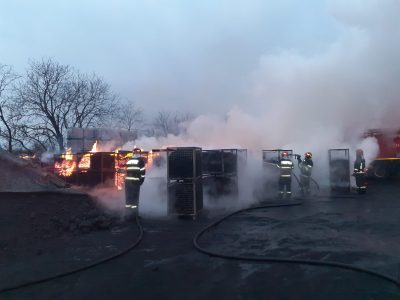 Incendiul s-a manifestat pe o suprafață de 150 mp și au fost afectate aproximativ 60 tone de cărbune. Am intervenit cu 6 autospeciale de stingere, 1 autospecială de salvare de la înălțime, 2 autospeciale de primă intervenție și comandă, 1 ambulanță SMURD.