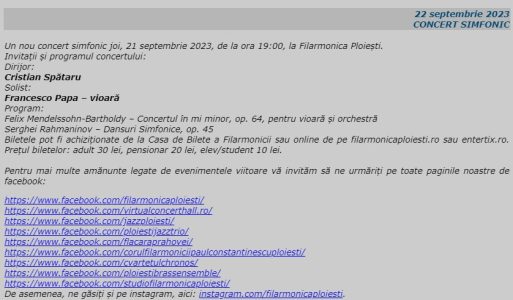 “Un nou concert simfonic joi, 21 septembrie 2023, de la ora 19:00, la Filarmonica Ploiești.