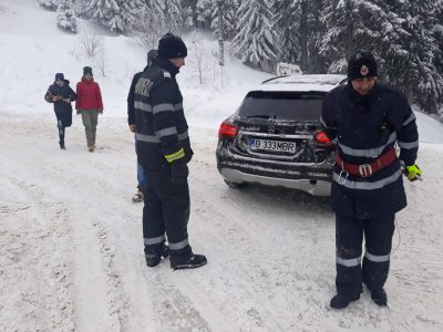 Joi dimineaţa, o aventură de iarnă era să se termine urât, la Sinaia. O familie a decis să facă o escapadă pe un drum înzăpezit în munte şi a rămas acolo. După ce au chemat ajutoare, de urgenţă au sosit pompierii militari, care au acţionat pentru deblocarea autoturismului rămas înzăpezit pe drumul spre Stâna Regală, a informat Inspectoratul pentru Situaţii de Urgenţă Prahova. În autoturism se afla familia, ce se deplasa spre Schitul Sfânta Ana, iar din cauza zăpezii nu a mai putut înainta. Alături de părinţi era şi fiul în vârstă de 9 ani. Pompierii s-au deplasat la faţa locului cu un UTV. În urma intervenţiei, maşina a fost deblocată din nămeţi şi aventura s-a terminat cu bine.