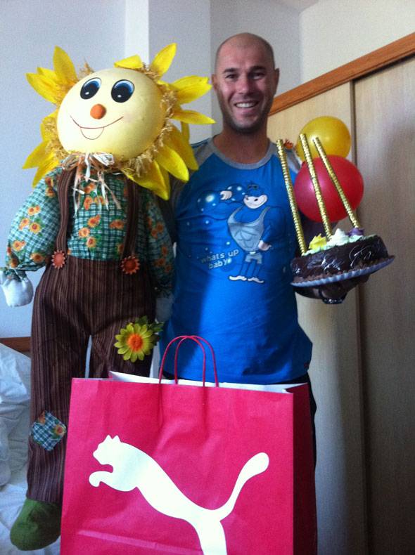 Astăzi, 6 octombrie 2013, în orașul în care SC FC Petrolul Ploiești a suferit ultimul eșec, pe data de 23 noimebrie 2012, din campionatul Ligii I, de atunci contabilizând 14 victorii și 12 remize, “lupii” au un motiv în plus, în afara obținerii revanșei în fața echipei Gaz Metan Mediaș, să obțină un scor favorabil, antrenorul de portari, Cătălin Grigore (foto jos; www.fcpetrolul.ro), împlinind vârsta de 36 de ani. La fel ca și ultimii aniversați din tabăra găzarilor, Grigore a primit un tort, dar și o păpușă uriașă, precum și cadoul de la dealerul firmei de echipament sportiv Puma și urările tuturor membrilor delegației deplasate în Ardeal. La fața locului, tehnicianul principal Cosmin Contra (foto sus; www.fcpetrolul.ro) va alege primul “11”, dintr-un lot din care lipsesc Laurențiu Marinescu, Manasse Ruben Enza-Yamissi, Hamza Younes și, din nou, Vlăduț Morar, cel care a acuzat iar dureri la un picior. Însă, Contra are soluții, astfel încât să le opună gazdelor o trupă capabilă de un succes sau, măcar, să nu piardă încă o dată.