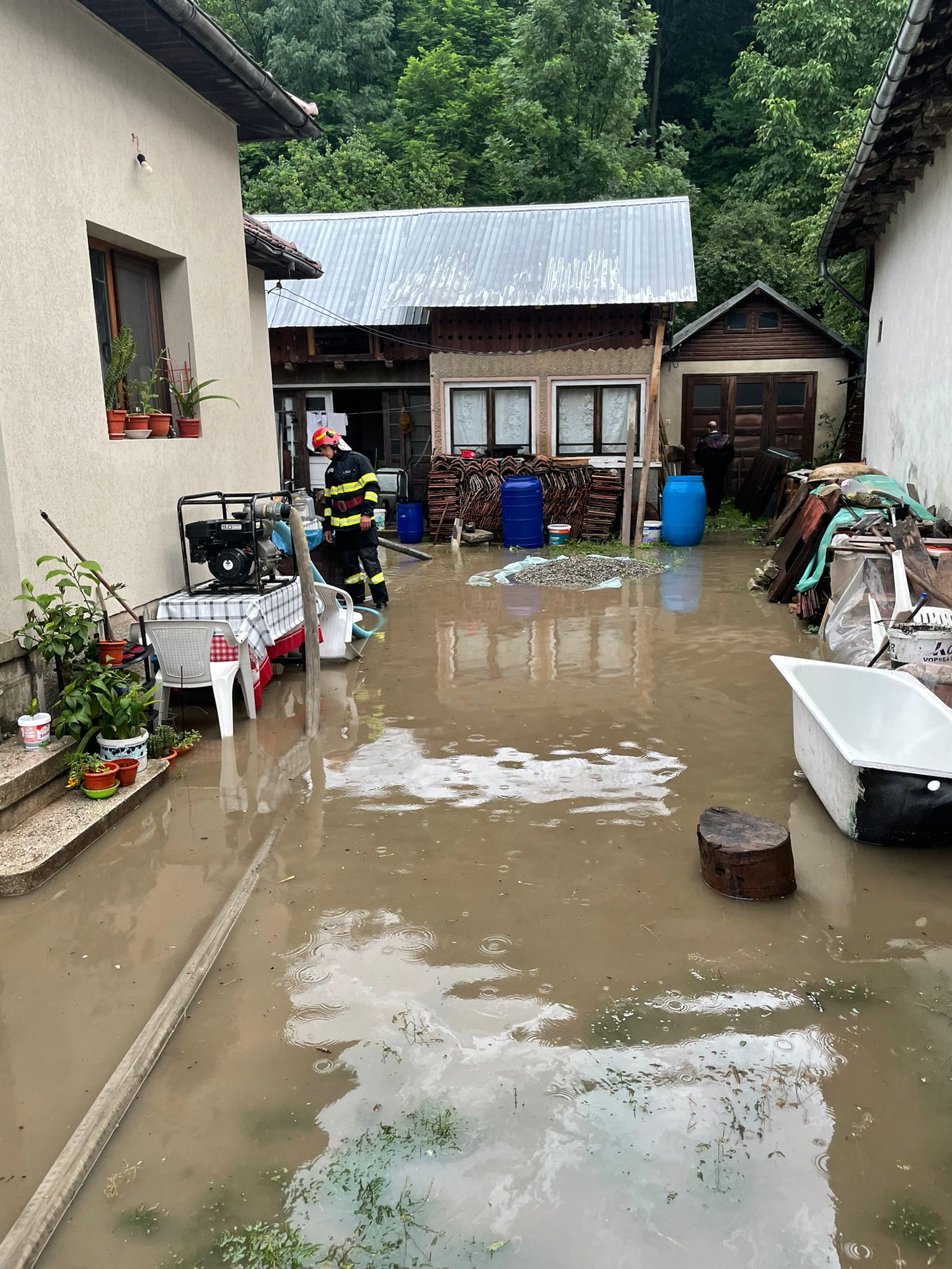 – În comuna Scorțeni, din cauza precipitațiilor abundente, DJ 100D este blocat, partea carosabilă fiind acoperită cu apă.