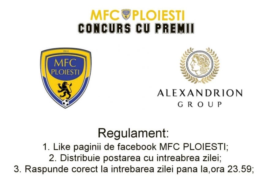 Regulamentul concursului, precum și alte informații legate de desfășurarea acestuia, se pot afla accesând siteul www.mfcploiesti.hornexpert.ro, iar la întrebările puse în trei zile următoare diferite se va răspunde pe https://www.facebook.com/MiniFotbalClubPloiesti/. Prima se va pune miercuri, 19 decembrie 2018, la 8.00, iar răspunsurile se vor aștepta până la ora 23.59. Următoarea întrebare se va posta pe 21 decembrie, iar a treia – pe 23 decembrie, de fiecare dată de la aceeași oră. Cei care doresc să intre în concurs au la dispoziție, deci, aproape 16 ceasuri pentru a răspunde corect. Nu ratați astfel participarea, pentru că veți avea numai de câștigat! De la “Alexandrion” și MFC Ploiești, desigur!