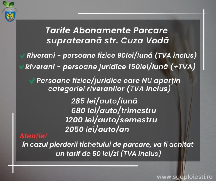 SGU Ploieşti le dă posibilitatea ploieştenilor – riverani sau nu – să închirieze un loc de parcare în parcarea supraterană de pe strada Cuza Vodă, din spatele Casei de Cultură a Sindicatelor Ploieşti.