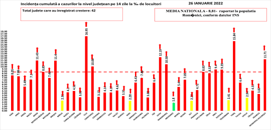 Coeficientul infectărilor cumulate la 14 zile, raportate la 1.000 de locuitori este calculat de către Direcțiile de Sănătate Publică, la nivelul Municipiului București și al județelor. Mai jos aveți graficul realizat în baza raportărilor primite de CNCCI de la Direcțiile de Sănătate Publică: