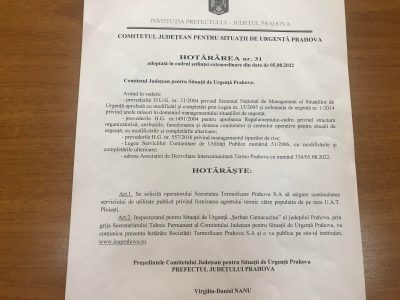 Comitetului Județean pentru Situații de Urgență a aprobat o hotărâre prin care s-a solicitat operatorului de termoficare să asigure continuitatea serviciului de livrare a apei calde către ploieșteni!