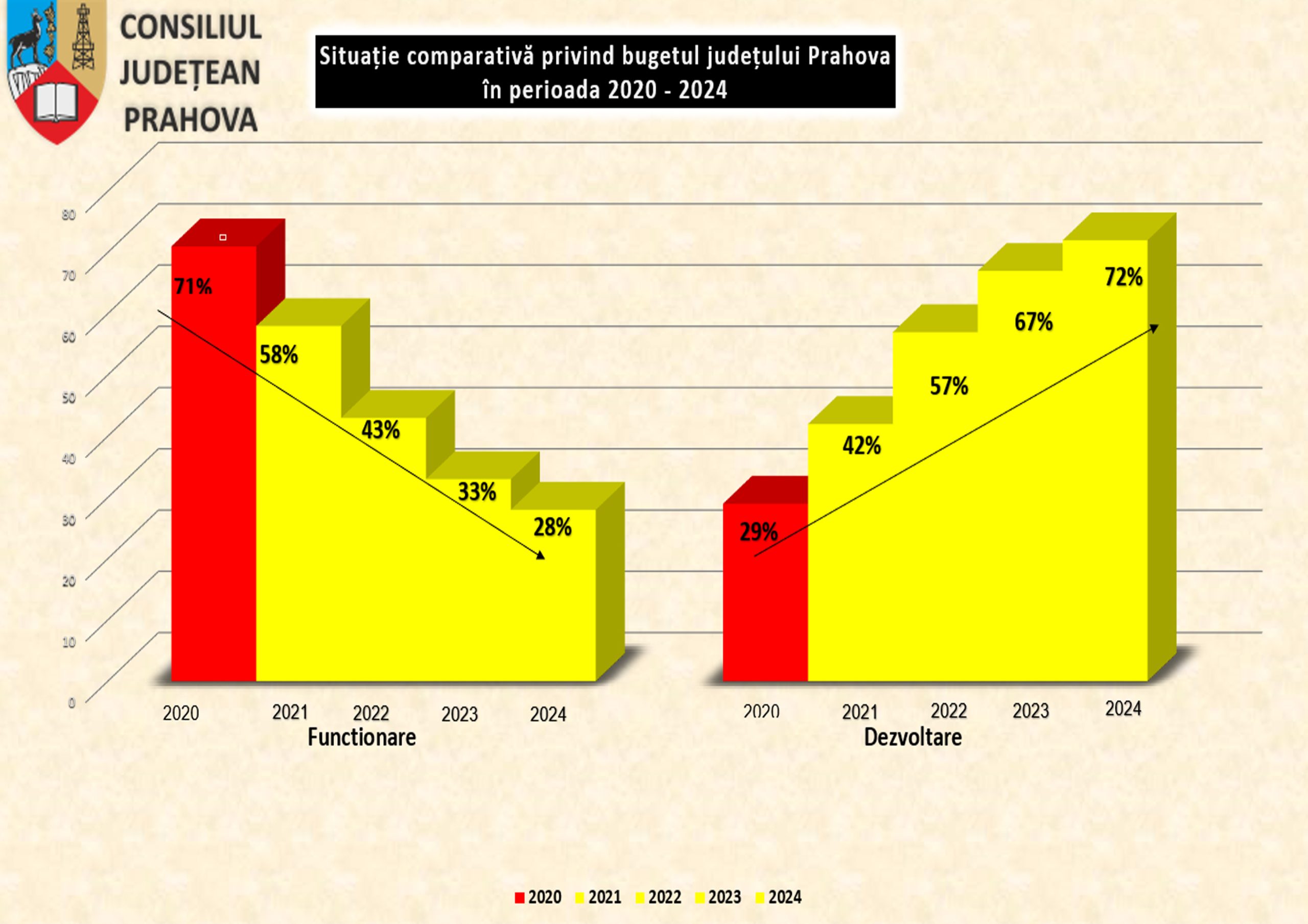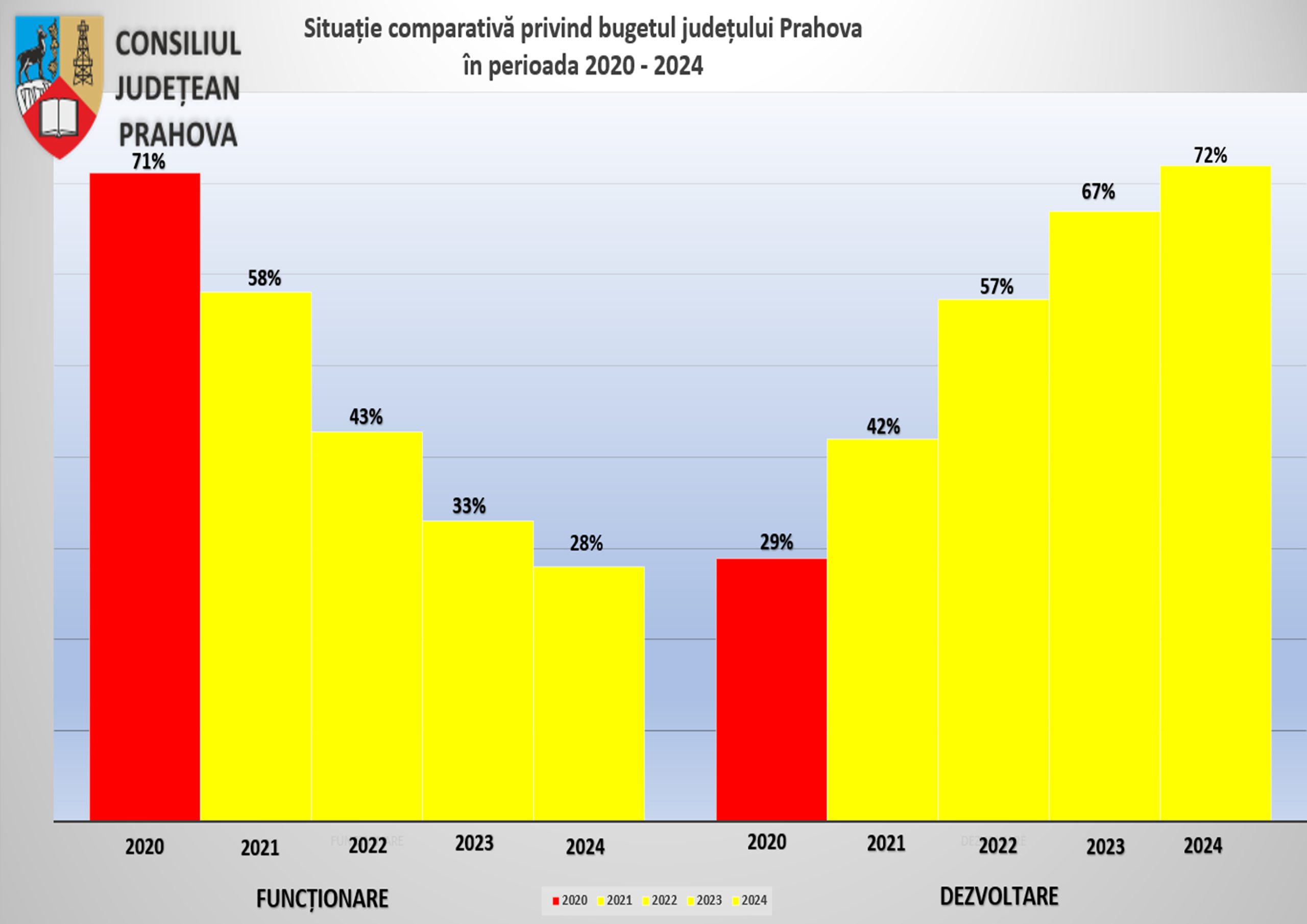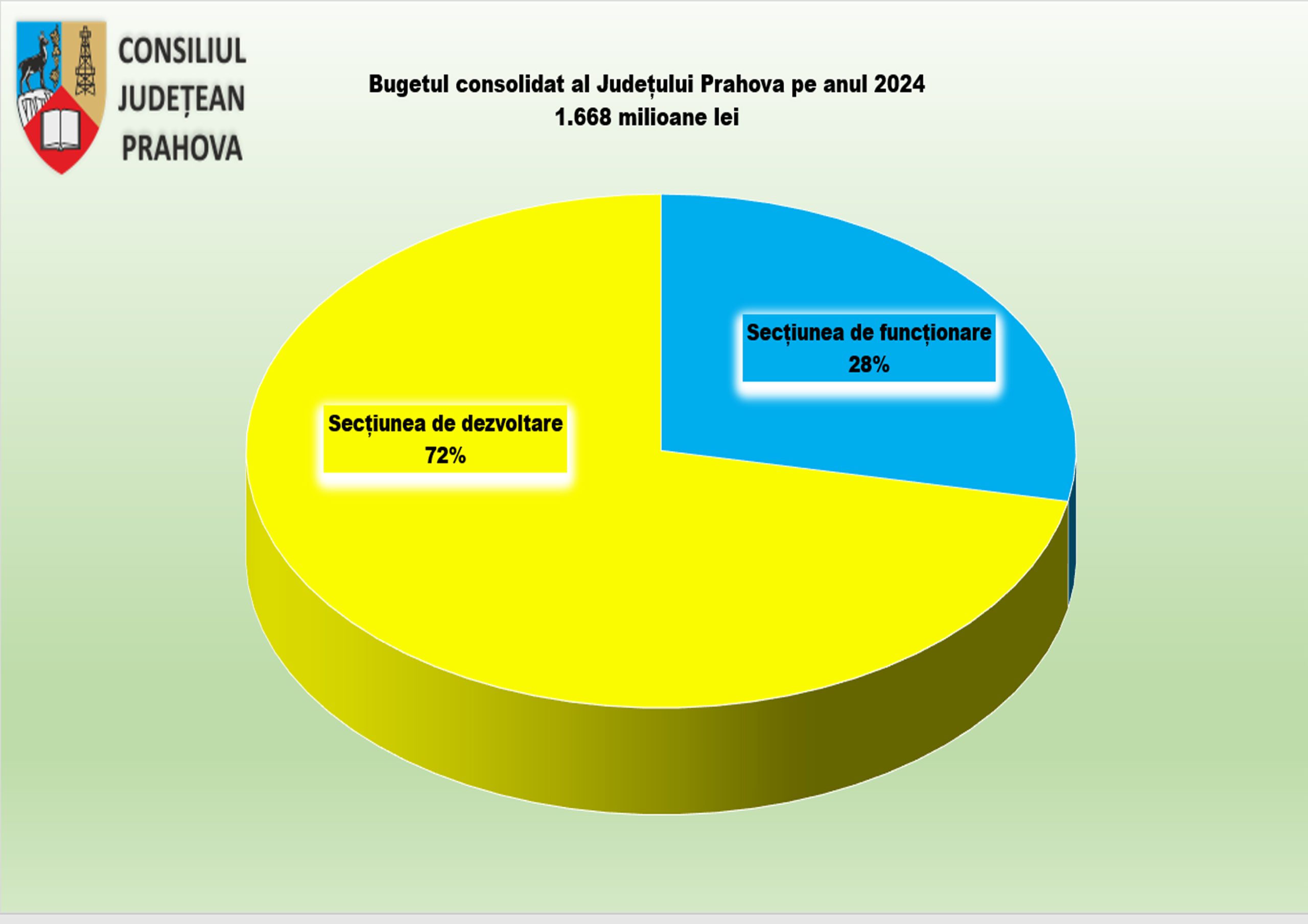 Consiliul Judeţean Prahova, reunit în şedinţă ordinară în data de 9 februarie, a aprobat bugetul judeţului pentru anul 2024. Valoarea totală a Bugetului aprobat este de 1,688 miliarde de lei, în creştere cu aproximativ 20% faţă de bugetul definitiv al judeţului Prahova din 2023 situat la 1,416 miliarde de lei. Cheltuielile aferente părţii de dezvoltare se situează la 1,198 de miliarde de lei (aproximativ 72% din total buget) şi cele ale părţii de funcţionare sunt estimate la 469,8 milioane de lei (aproximativ 28% din total buget).