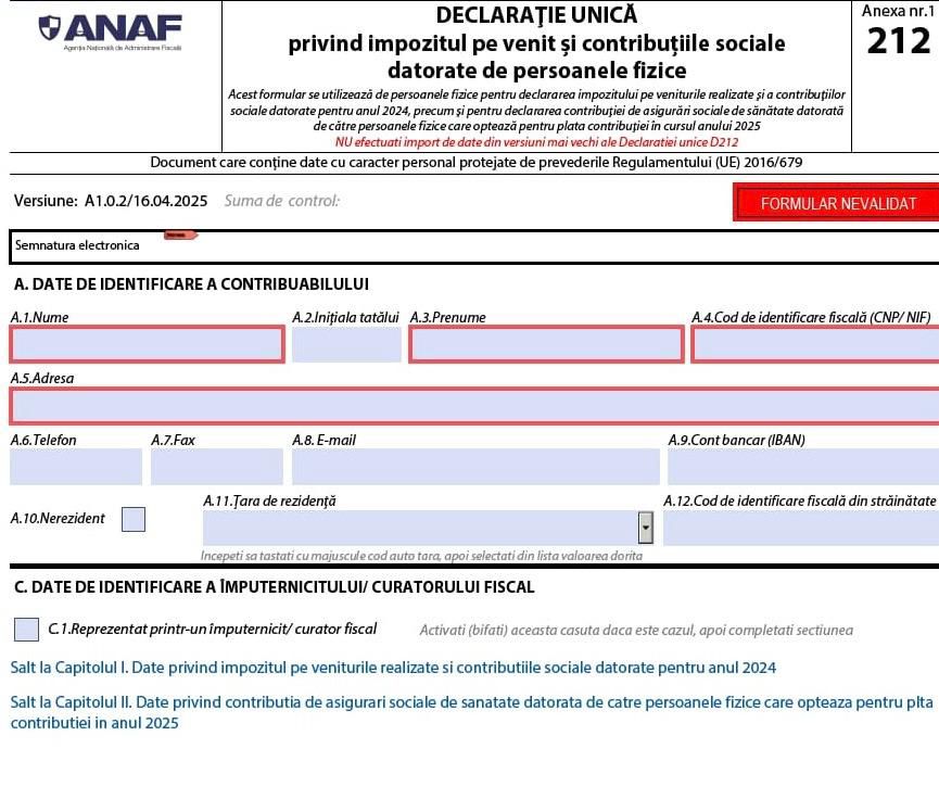 Termenul limită pentru depunerea Declarației unice (Formular 212) este 26 mai 2025 (inclusiv), pentru veniturile obținute în anul precedent.