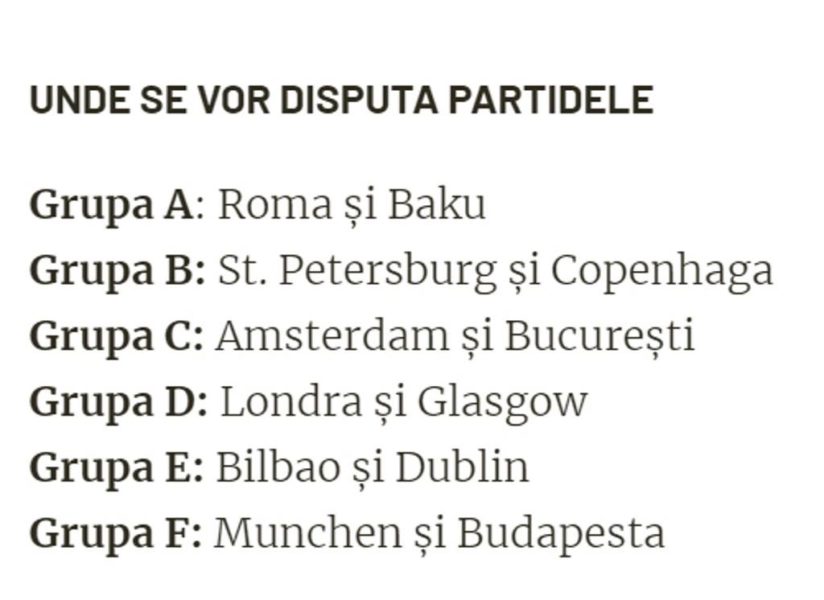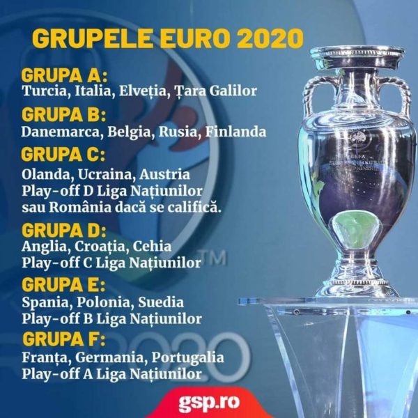 De subliniat că la tragerea la sorți efectuată de către foste glorii din fotbalul european a fost co-prezentatoare Corina Caragea, bine cunoscută de la Știrile Pro TV, partea de sport, și iubită a vicepreședintelui LPF, Robert Pongracz. În primul rând, la ROMEXPO, slovenul Aleksander Ceferin, președintele UEFA, și Răzvan Burleanu, președintele FRF, l-au încadrat pe mai noul premier al României, Ludovic Orban. După ce-a aflat că, dacă se califică, România nu va pica în grupa de foc cu Germania, Franța și Portugalia, Burleanu a răsuflat ușurat, dialogând “peste” Orban, cu zâmbetul pe buze, cu șeful său de la Nyon. Dar, să ajungem la turneul final și apoi o să vedem ce și cum. Meciuri cu Ucraina și Austria ar părea abordabile la prima vedere, dar așa a fost și cu… Norvegia și Suedia, acasă, dar am luat numai un singur punct! Componența tuturor celor șase grupe și orașele în care se va juca în fiecare le aveți în ilustrațiile acestui text. De notat că, după partidele din grupe, se vor califica mai departe primele două clasate din cele șase serii, plus patru cele mai bine clasate locuri 3. Bucureștiul va găzdui trei meciuri din grupe și o “optime”.