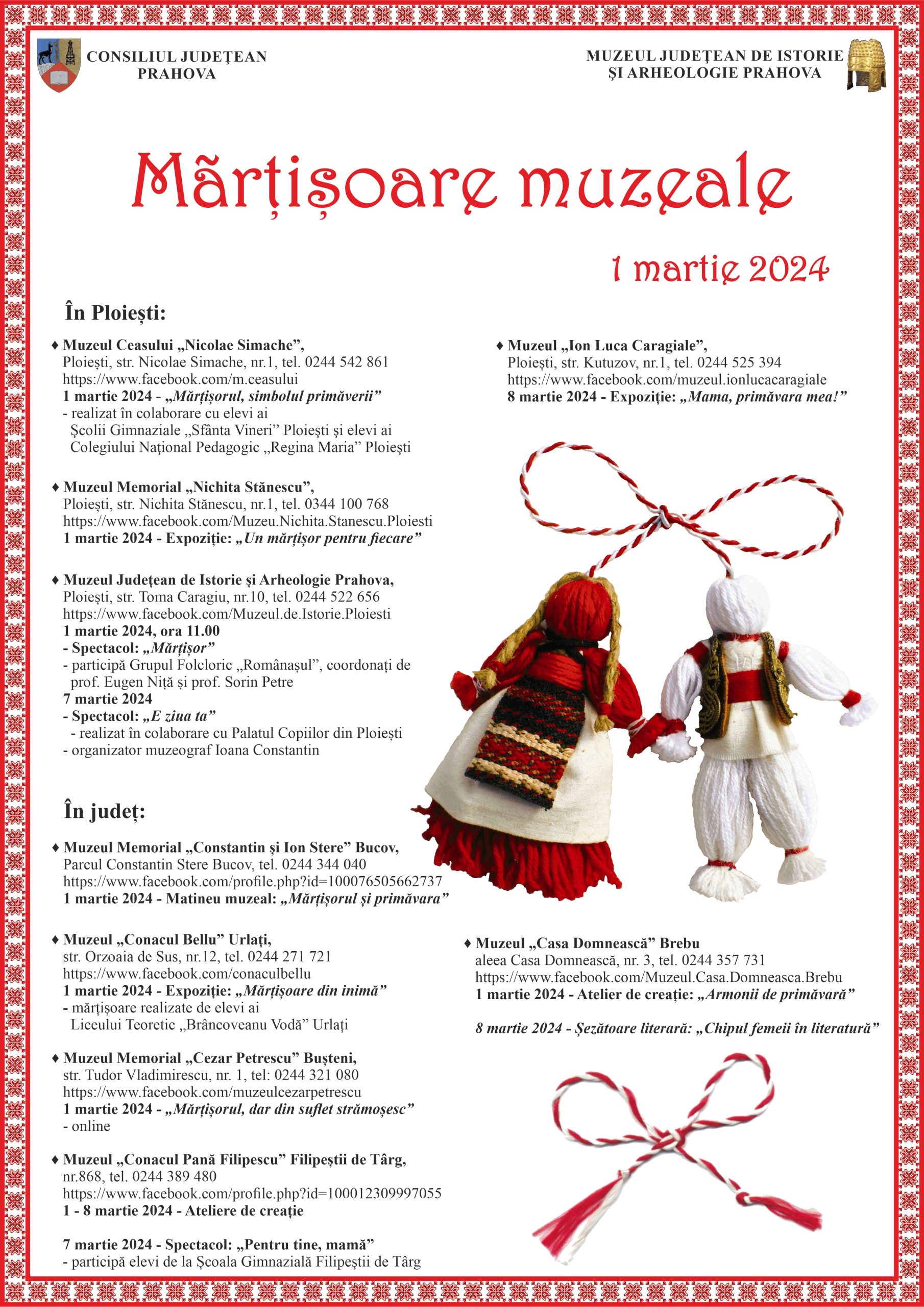 Muzeul Județean de Istorie și Arheologie Prahova şi secţiile sale din Ploieşti şi judeţ întâmpină primăvara cu „Mărţişoare muzeale” – expoziţii, matinee muzeale, ateliere de creație și spectacole dedicate anotimpului renașterii, oferite cu drag publicului în perioada 1 – 8 martie 2024: