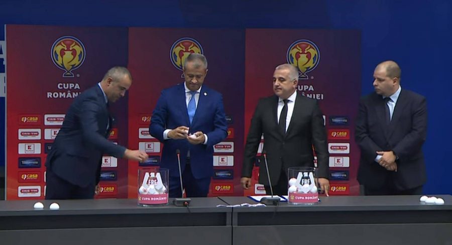 Astăzi, 12 septembrie 2019, într-una dintre sălile de la Casa Fotbalului, din București, amfitrionii Gabriel Bodescu (foto, al doilea de la stânga; secretar general adjunct al FRF) și Felix Grigore (foto, al doilea de la dreapta; șeful Comisiei de Competiții al FRF), ajutați de doi subalterni, au procedat la tragerea la sorți a “16”-imilor ediției 2019-2020 a Cupei României, fază în care, în intervalul 24-26 septembrie, vor intra în competiție și cele 14 echipe din Liga 1. După cum am scris, cele 32 de grupări calificate în această fază au fost împărțite în două urne, cea capilor de serie, respectiv cea de-a doua, una cuprinzând 15 formații, cealaltă – 17, împerechindu-se cele 15 formații cu tot atâtea din urna a doua, ultimele trupe rămase jucând între ele. Iată care a fost țintarul care a rezultat în urma tragerii la sorți: