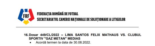 În schimb, Félix Mathaus nu a avut noroc la ședința CNSL, discutarea cazului acestuia fiind decalată până pe 30 august (vezi facsimil, mijloc). De reamintit că Mathaus a evoluat până la finalului sezonului trecut al Ligii 1, fiind căpitanul echipei Gaz Metan Mediaș. Din acest motiv, ste posibil să fi depus mai târziu – decât alți foști jucători ai ardelenilor – actele pentru a deveni liber de contract. Dar, mai mult ca sigur, acest fapt va prinde concretețe peste numai cinci zile. După ce va căpăta acest statut, fotbalistul din Insulele Capului Verde va fi legitimat imediat și inclus în efectivul “lupilor”, fiind cu pregătirile la zi, conform aceluiași Claudiu Tudor.