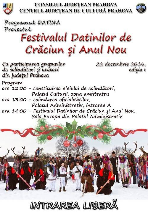 Consiliul Județean Prahova şi Centrul Județean de Cultură Prahova organizează prima ediție a Festivalului Datinilor de Crăciun și Anul Nou, în ziua de 22 decembrie 2016, ora 13,00 la Ploiești, în fața Palatului Administrativ și la ora 14,00 Sala Europa a Consiliului Județean Prahova.