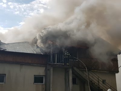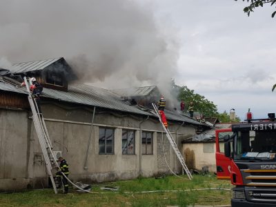 Incendiul s-a manifestat cu flacără deschisă și degajare de fum, la nivelul acoperișului, pe o suprafață de aproximativ 450 mp.