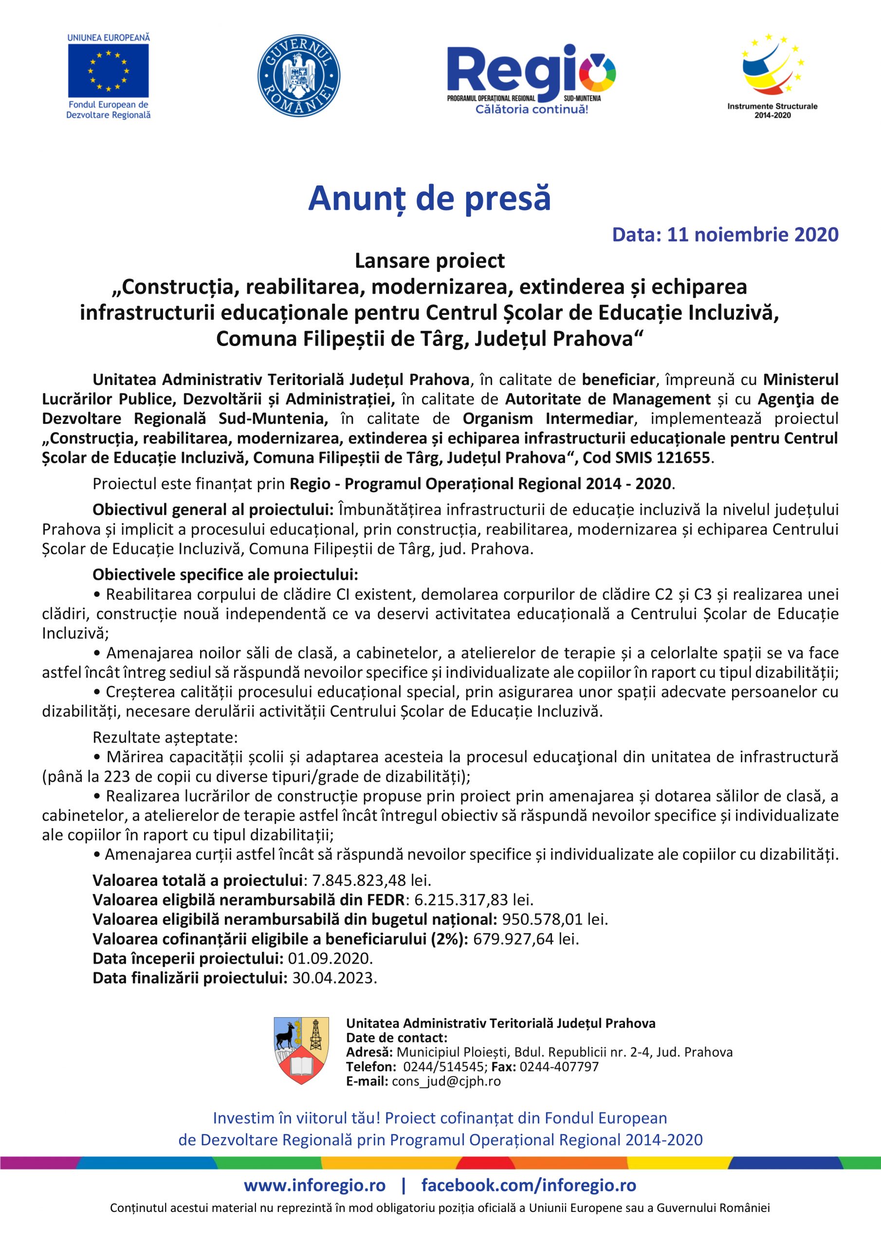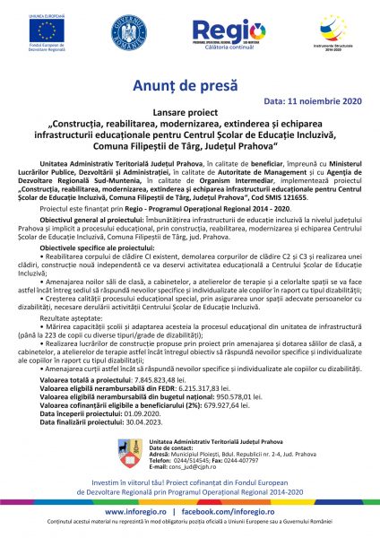 Lansare proiect „Construcția, reabilitarea, modernizarea, extinderea și echiparea infrastructurii educaționale pentru Centrul Școlar de Educație Incluzivă, Comuna Filipeștii de Târg, Județul Prahova“