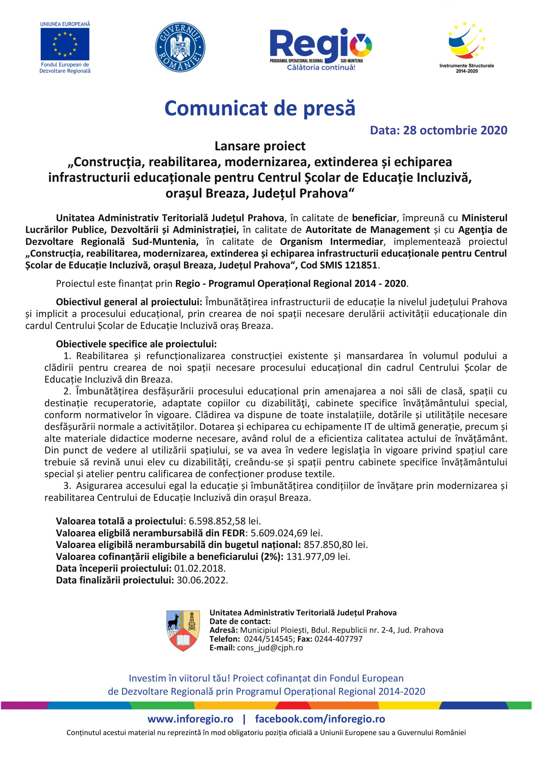 Lansare proiect “Constructie, reabilitarea,modernizarea,extinderea si echiparea infrastructurii educationale pentru Centrul Scolar de Educatie Incluziva, orasul Breaza, Judetul Prahova”