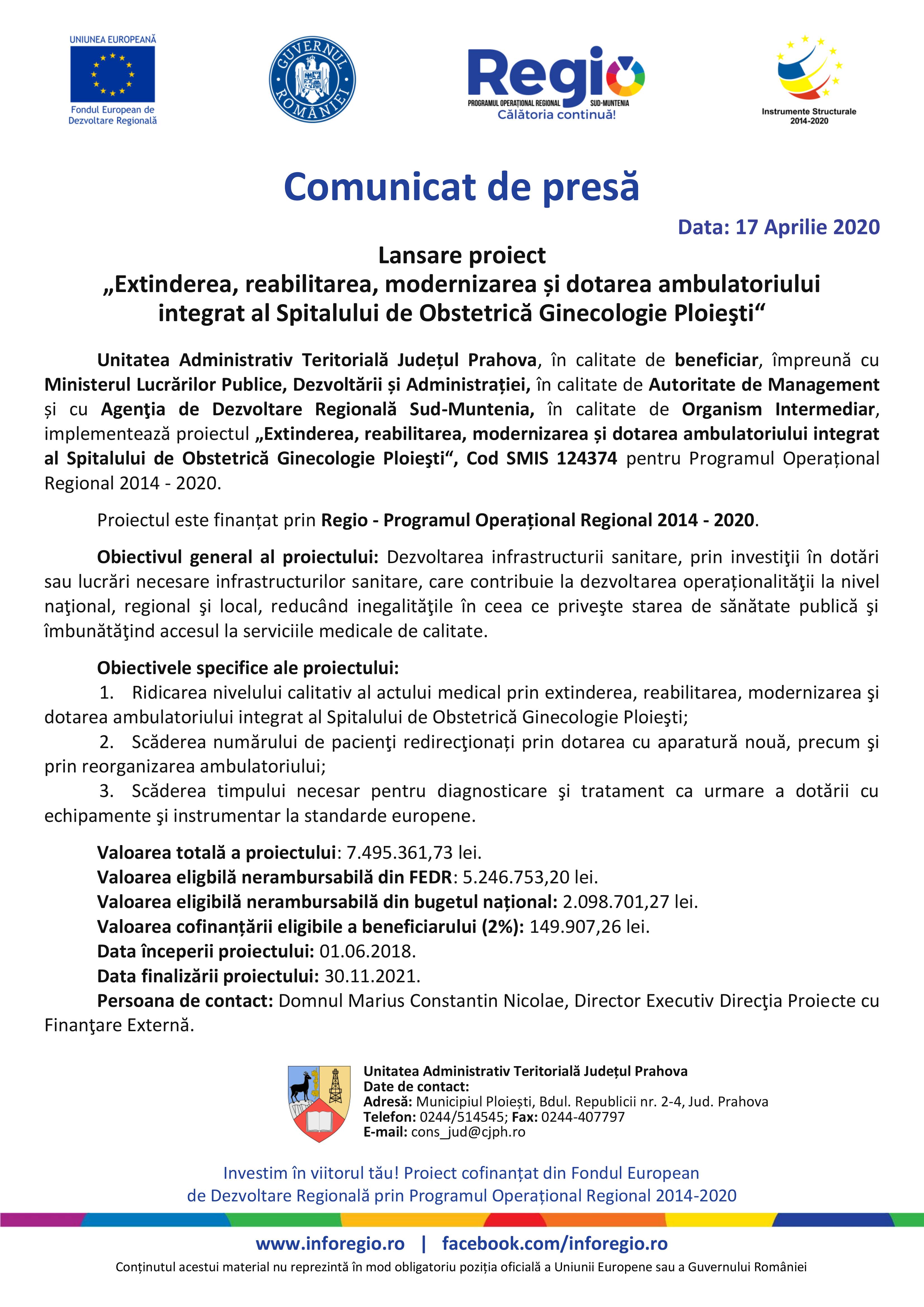 Unitatea Administrativ Teritorială Județul Prahova, în calitate de beneficiar, împreună cu Ministerul Lucrărilor Publice, Dezvoltării și Administrației, în calitate de Autoritate de Management și cu Agenţia de Dezvoltare Regională Sud-Muntenia, în calitate de Organism Intermediar, implementează proiectul „Extinderea, reabilitarea, modernizarea și dotarea ambulatoriului integrat al Spitalului de Obstetrică Ginecologie Ploieşti“, Cod SMIS 124374 pentru Programul Operațional Regional 2014 – 2020.