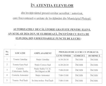 Începând cu 02.09.2024, vor fi suplimentate tonetele pentru eliberarea autorizațiilor de călătorie gratuite destinate elevilor, informează TCE Ploieşti.