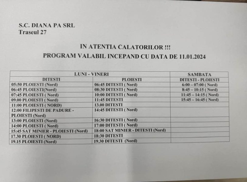 Referitor la situația privind naveta elevilor, cât și a celorlalți navetiști pe traseul Ploiești-Dițesti și retur, în urma discuțiilor avute cu operatorul de transport, am reușit stabilirea programului favorabil tuturor.