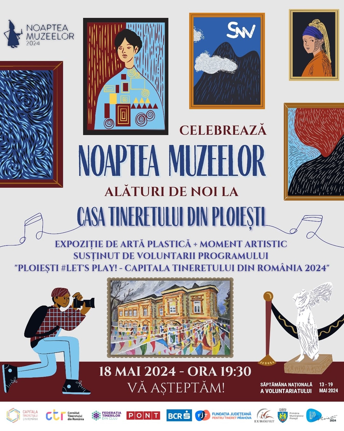 Cu ocazia Zilei Picturii Naționale, Casa Tineretului din Ploiești găzduiește o expoziție de artă plastică în perioada 15-18 mai 2024. În încheierea expozitiei, de Noaptea Muzeelor, am pregătit câteva momente artistice surpriză, dedicate iubitorilor de artă, îmbinând pictura cu muzica. Astfel, în intervalul 19:30-21:00, ne vom bucura de momente muzicale live, interpretate de 3 tineri talentați din Ploiești, voluntari în cadrul programului „Ploiești #LetsPLAY- Capitala Tineretului din România 2024″.