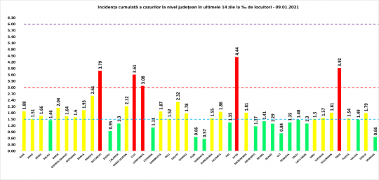 Coeficientul infectărilor cumulate la 14 zile, raportate la 1.000 de locuitori este calculat de către Direcțiile de Sănătate Publică, la nivelul Municipiului București și al județelor. Mai jos aveți graficul realizat în baza raportărilor primite de CNCCI de la Direcțiile de Sănătate Publică: