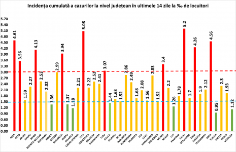 Coeficientul infectărilor cumulate la 14 zile, raportate la 1.000 de locuitori este calculat de către Direcțiile de Sănătate Publică, la nivelul Municipiului București și al județelor. Mai jos aveți graficul realizat în baza raportărilor primite de CNCCI de la Direcțiile de Sănătate Publică: