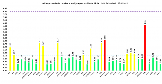 Coeficientul infectărilor cumulate la 14 zile, raportate la 1.000 de locuitori este calculat de către Direcțiile de Sănătate Publică, la nivelul Municipiului București și al județelor. Mai jos aveți graficul realizat în baza raportărilor primite de CNCCI de la Direcțiile de Sănătate Publică: