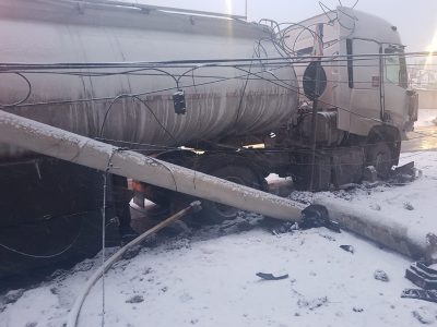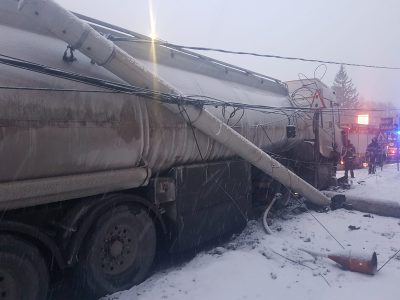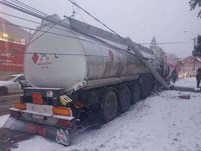 O autocisternă încărcată cu carburanți a retezat un stâlp de electricitate la Bușteni
