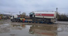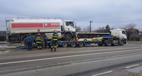 O cisternă încărcată cu motorină a alunecat de pe trailerul care o transporta, pe DN1A
