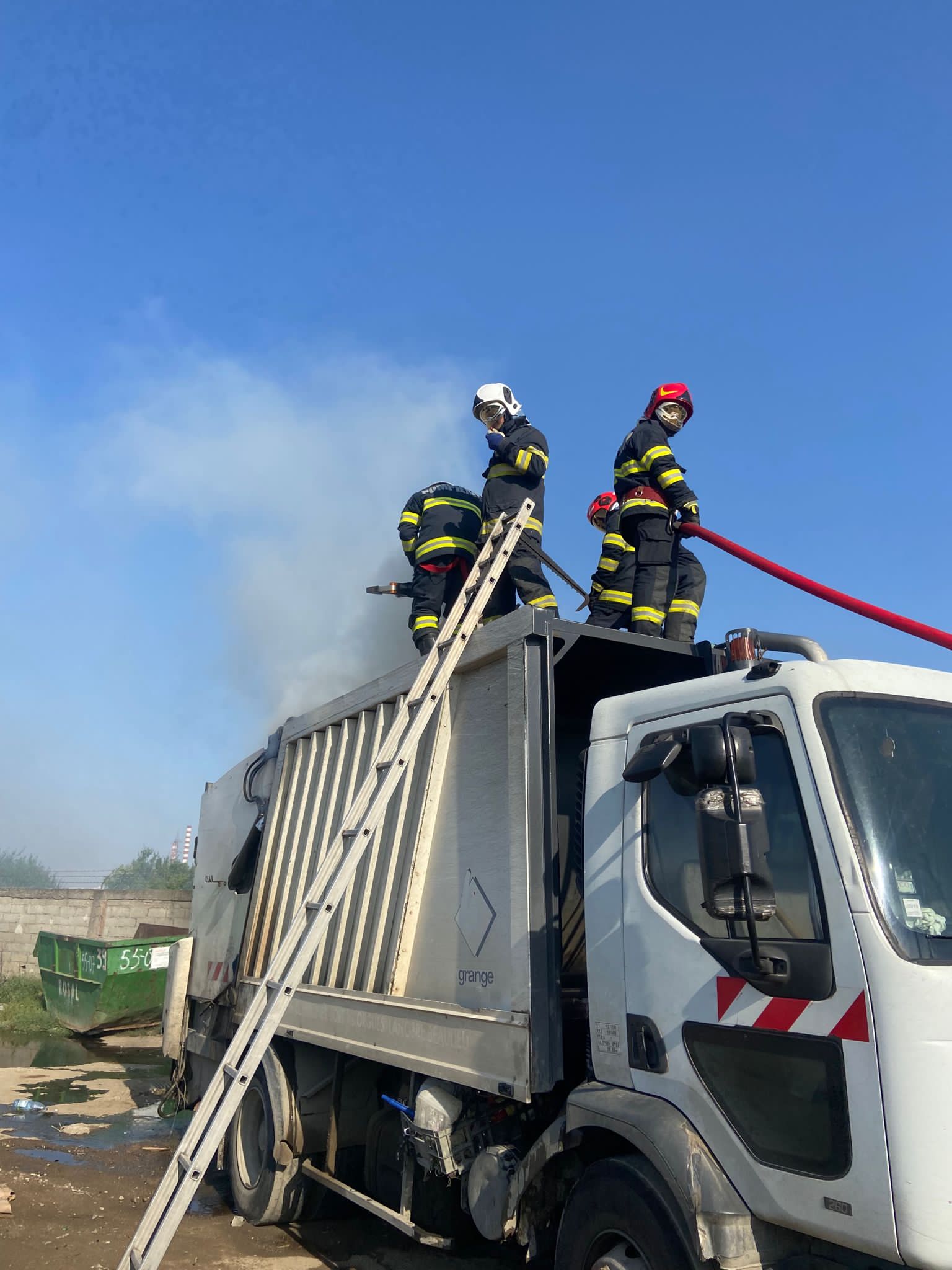 O maşină de gunoi a luat foc pe o stradă din Ploieşti