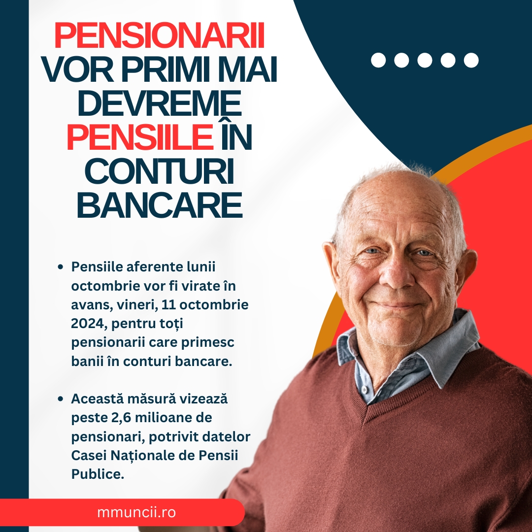 Ministerul Muncii şi Solidarităţii Sociale informează că pensiile aferente lunii octombrie vor fi virate în avans, vineri, 11 octombrie 2024, pentru toţi pensionarii care primesc banii în conturi bancare.