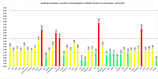 Coeficientul infectărilor cumulate la 14 zile, raportate la 1.000 de locuitori este calculat de către Direcțiile de Sănătate Publică, la nivelul Municipiului București și al județelor. Mai jos aveți graficul realizat în baza raportărilor primite de CNCCI de la Direcțiile de Sănătate Publică: