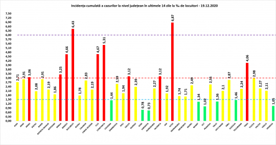 Coeficientul infectărilor cumulate la 14 zile, raportate la 1.000 de locuitori este calculat de către Direcțiile de Sănătate Publică, la nivelul Municipiului București și al județelor. Mai jos aveți graficul realizat în baza raportărilor primite de CNCCI de la Direcțiile de Sănătate Publică: