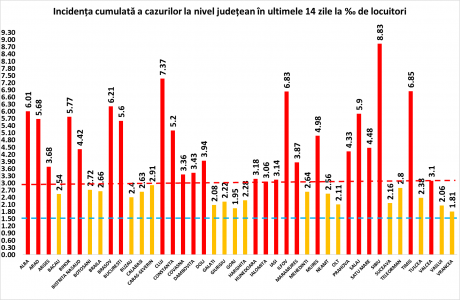 Coeficientul infectărilor cumulate la 14 zile, raportate la 1.000 de locuitori este calculat de către Direcțiile de Sănătate Publică, la nivelul Municipiului București și al județelor. Mai jos aveți graficul realizat în baza raportărilor primite de CNCCI de la Direcțiile de Sănătate Publică: