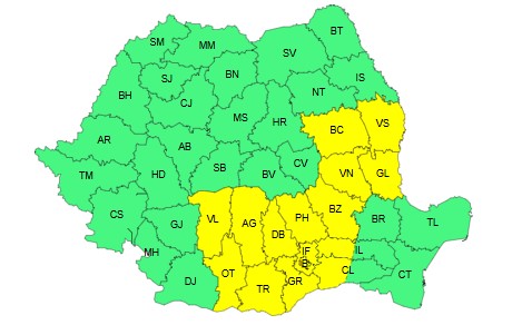 În estul Olteniei, cea mai mare parte a Munteniei și în jumătatea sudică a Moldovei vor fi perioade cu instabilitate atmosferică accentuată ce se va manifesta prin averse torențiale, descărcări electrice, intensificări ale vântului, vijelii (rafale în general de 50…70 km/h) și grindină. În intervale scurte de timp sau prin acumulare cantitățile de apă vor fi de 20…30 l/mp și izolat de peste 40 l/mp.
