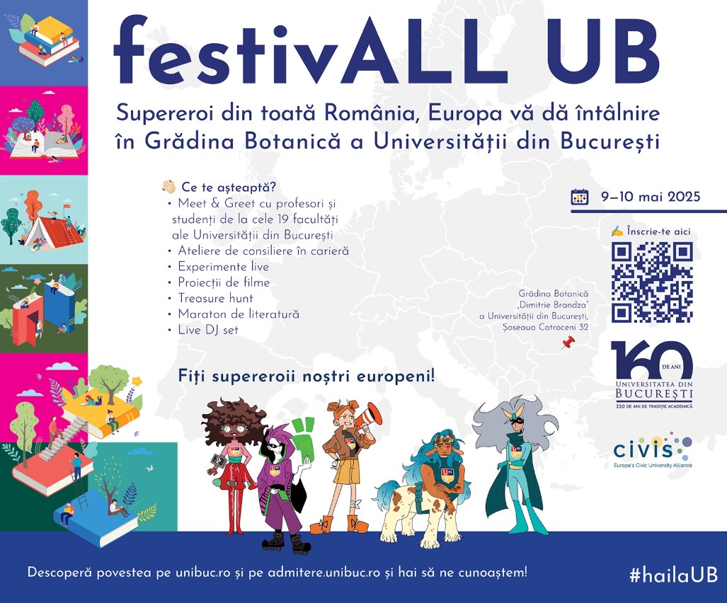 Universitatea din București (UB) va organiza în perioada 9 – 10 mai 2025, primul FestivALL UB dedicat elevilor care își doresc să descopere viața de student în București.