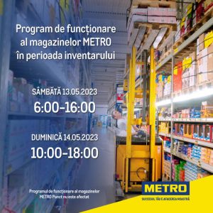 “Weekend-ul acesta 13-14 mai 2023 în magazinele METRO va avea loc inventarul anual, iar programul de funcționare al magazinelor, pentru aceste, zile va fi modificat. Pentru o experiență cât mai bună la cumpărături, te invităm să îți stabilești următoarea vizită în magazin în funcție de programul de mai jos. Îți mulțumim!”, transmit cei de la METRO într-o postare pe Facebook.