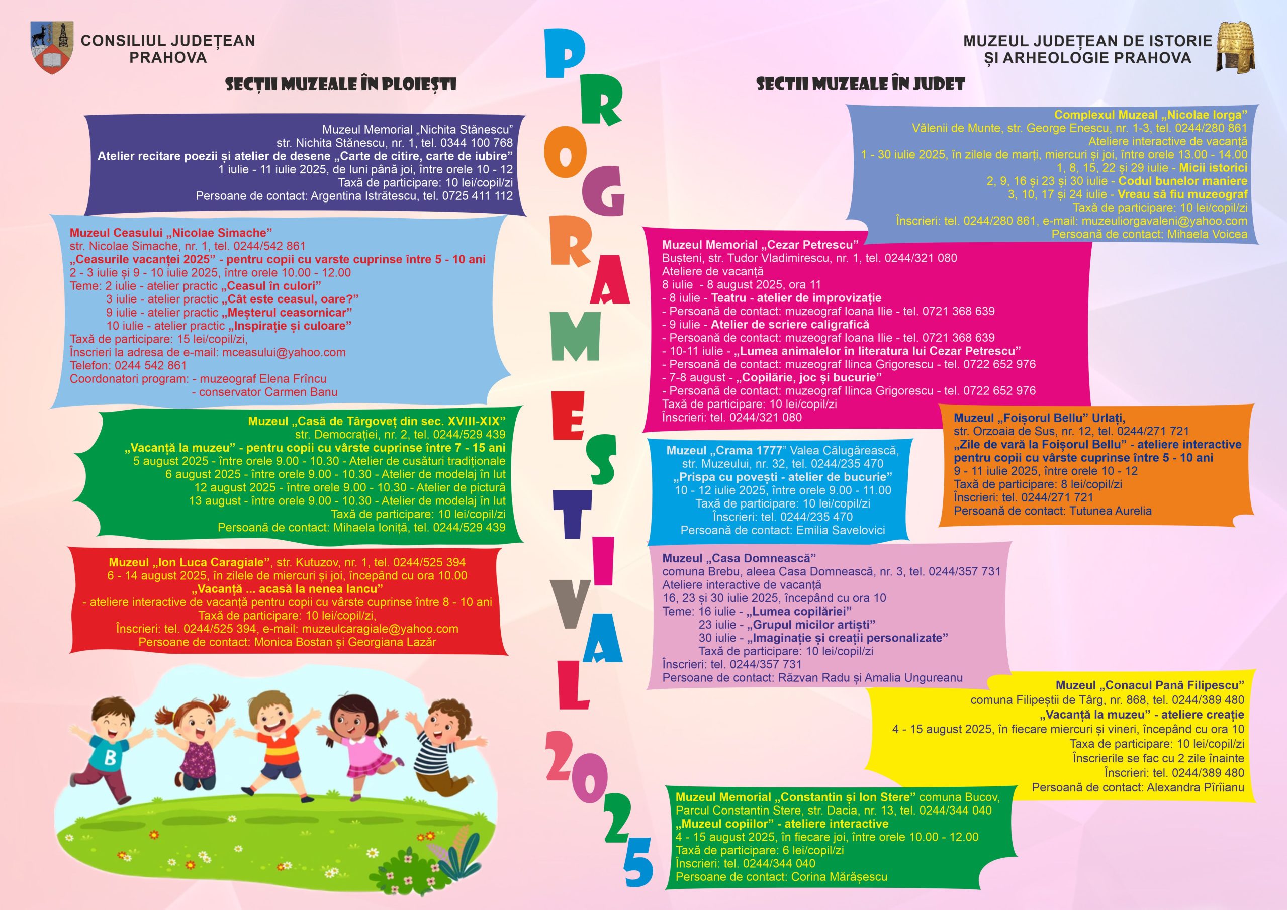 Muzeul Județean de Istorie și Arheologie Prahova și secțiile sale muzeale din Ploiești și județ oferă copiilor posibilitatea participării la ateliere interactive de creație/comunicare și la interesante incursiuni cultural-istorice, în vederea petrecerii instructiv-educative a vacanței de vară 2024, după următorul program: