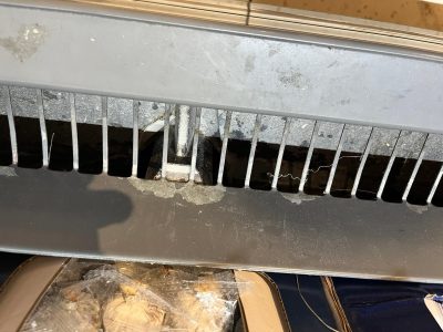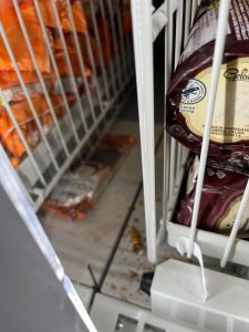 – utilizarea unor vitrine frigorifice neigienizate corespunzător, cu chedere murdare, strat de praf, mâzgă, cu scurgeri de lichide și rugină și a unor lăzi frigorifice cu acumulări masive, excesive de gheață, praf, impurități, resturi alimentare și păr
